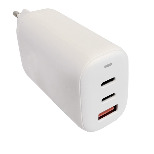 Caricatore da muro TECHLY 65W con 2 porte USB-C e 1 USB-A: potenza elevata, versatilità e praticità in un solo caricatore. Supporta ricarica rapida per laptop, tablet e smartphone senza dover usare più alimentatori, con protezioni per sicurezza e un LED di stato blu per indicare il funzionamento.